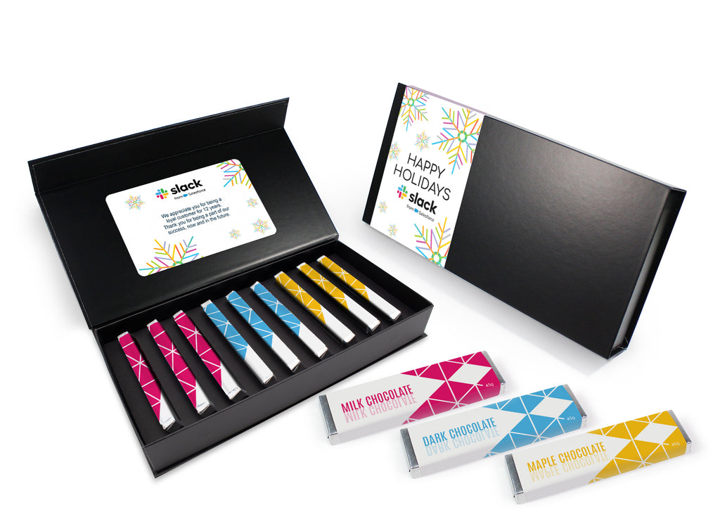 A premium gift box that sets the bar high. This sleek black magnetic gift box is wrapped with a fully customizable belly band and finished with an interior note card, giving your brand plenty of room to shine. Inside is an assortment of nine chocolate bars—three milk truffle, three dark truffle, and three maple truffle—making it a thoughtful, premium gift that’s as fun to sample as it is to share.