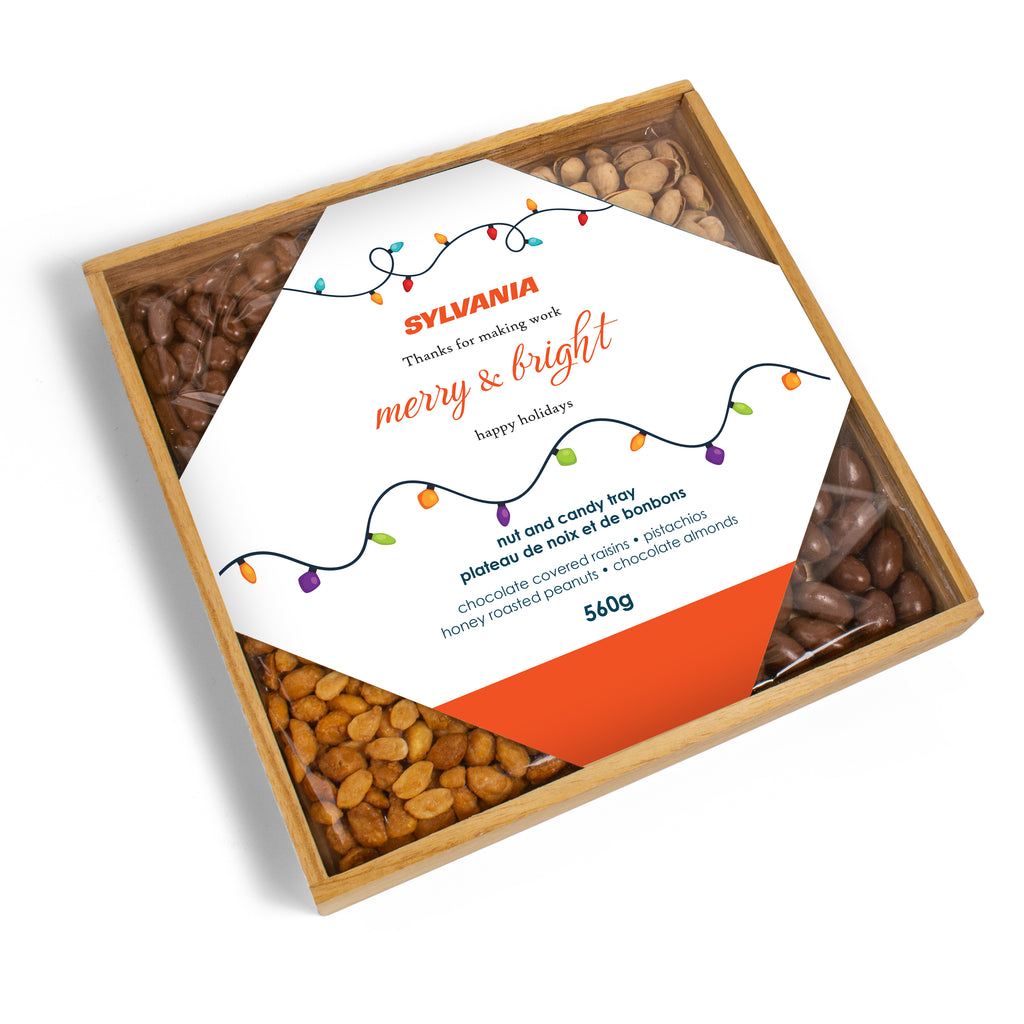 Presented in a wooden gift crate with a clear sliding lid and a customizable cover, this premium gift offers both elegance and impact. Inside are four crave-worthy selections: chocolate raisins, salted pistachios, milk chocolate covered almonds, and honey roasted peanuts. Generous, premium, and brand-forward, it’s a gift designed to impress.
